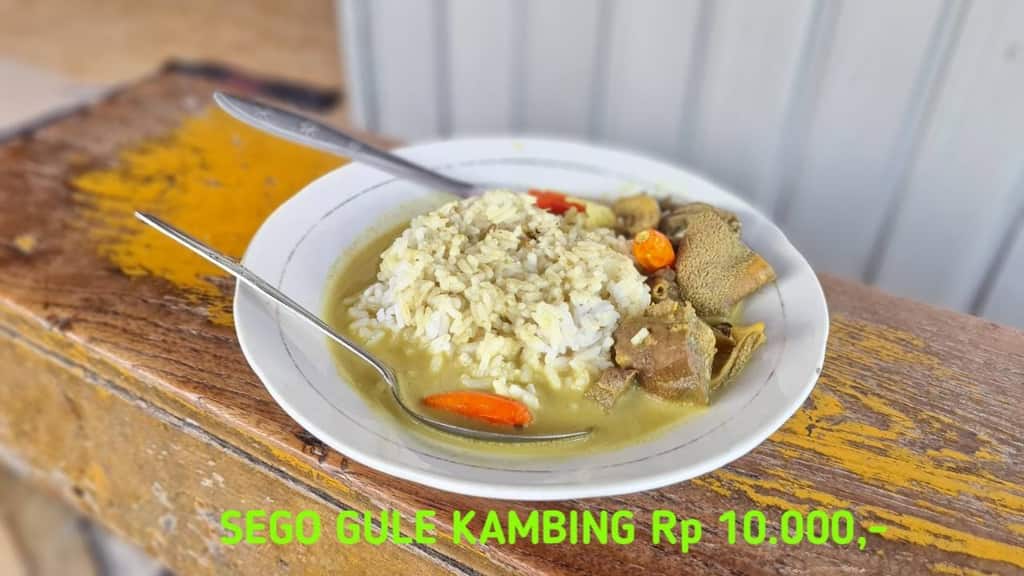 Khusus malam hari, kami juga menyajikan sego gulai kambing seharga Rp 10.000. Saat ini menu ini tersedia malam hari, dan ke depan insyaAllah akan tersedia siang dan malam.