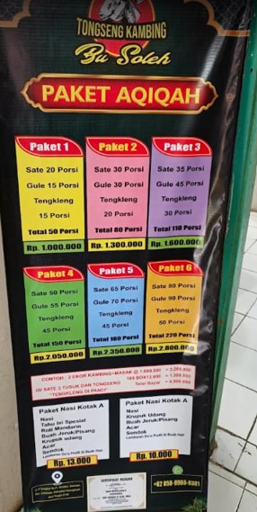 - Tengkleng solo kepala kambing + 4 kaki kambing Rp 150.000,- per porsi (cukup untuk 4–8 orang)